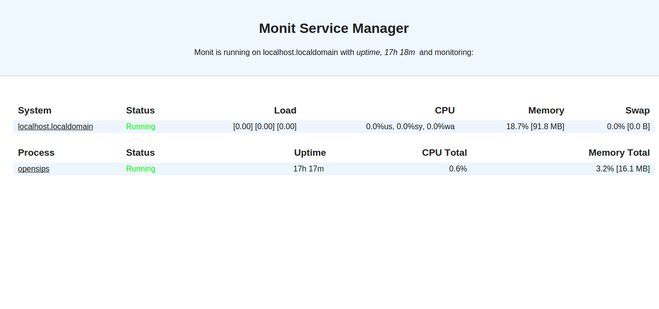 上述配置的含义为监听192.168.163.36 5060 端口,如果失败,则重启opensips。在重启5次失败后不再重试,避免无限循环。这样,即使在终端运行killall opensips后,在30秒内,monit会自动重启opensips服务。monit的log被配置在/var/log/monit.log文件,可以通过192.168.163.36:2812访问web控制台(需要关闭iptables或添加例外,如配置文件中,用户名为admin密码monit)。