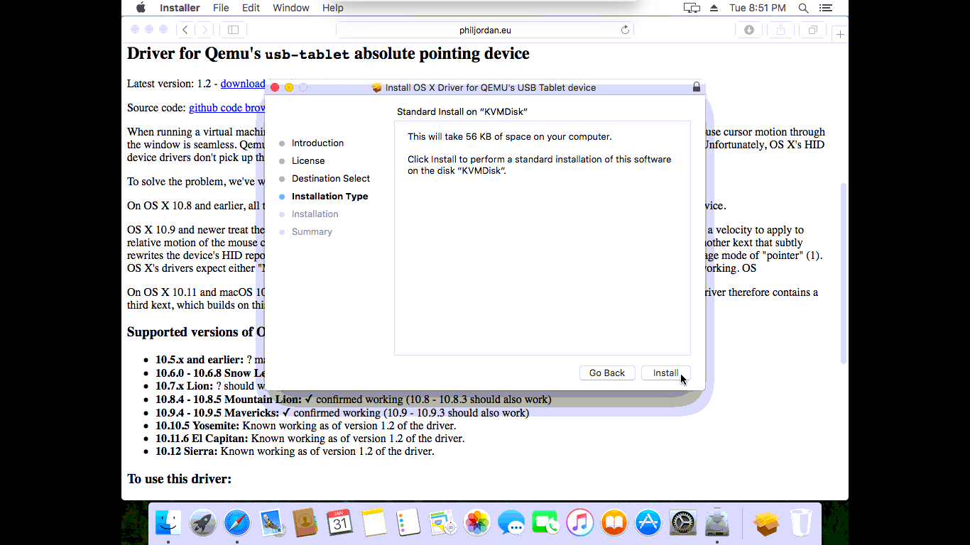 在 mac 虚拟机里打开 http://philjordan.eu/osx-virt/ 并下载 http://philjordan.eu/osx-virt/binaries/QemuUSBTablet-1.2.pkg 文件安装。