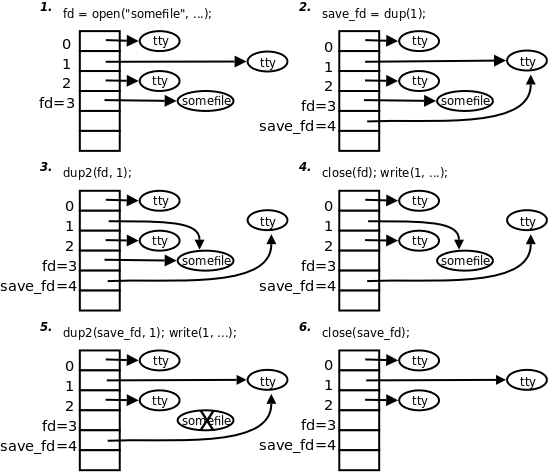 第3幅图,要执行dup2(fd, 1);,文件描述符1原本指向tty,现在要指向新的文件somefile,就把原来的关闭了,但是tty这个文件原本有两个引用计数,还有文件描述符save_fd也指向它,所以只是将引用计数减1,并不真的关闭文件。